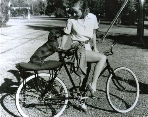 Both Katharine Hepburn and Veronica Lake find creative ways to sit on their bicycles